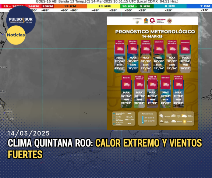 - Benito Juárez (Cancún): Cielo parcialmente nublado y viento del sureste con rachas de hasta 35 km/h. Se espera un día caluroso, con temperaturas máximas entre 31°C y 33°C. La sensación térmica podría alcanzar los 37°C. 🌞🌬️