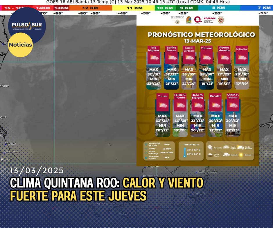 Resumen: Un sistema anticiclónico generará condiciones estables sobre Quintana Roo. Se espera un ambiente caluroso, con cielos despejados a parcialmente nublados y pocas probabilidades de lluvia. Las rachas de viento llegarán a los 40 km/h en las zonas costeras.