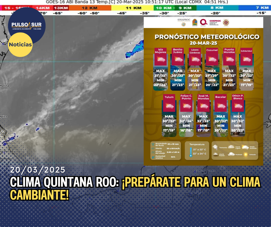 - Tulum y otros municipios: Cielos parcialmente nublados con lluvias y chubascos aislados. Temperaturas de 30-32°C, sensación térmica de 35°C.