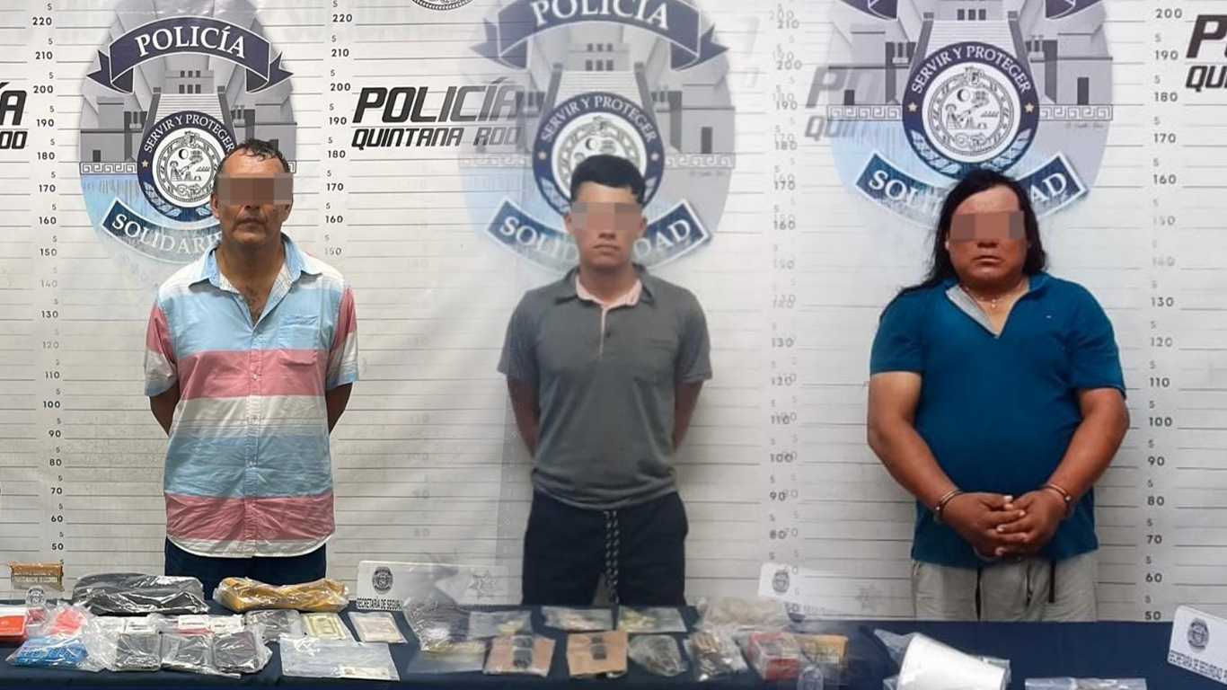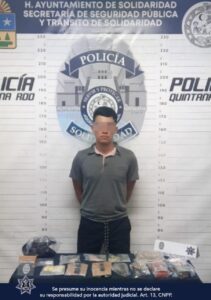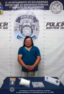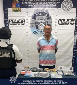 En otro punto de la ciudad, agentes de la Policía Turística detuvieron a Leonardo “N”, un hombre de 60 años y originario de Jalisco. Durante una inspección, se encontraron 20 envoltorios con presunta marihuana, 4 teléfonos celulares, una cantidad de dinero en efectivo tanto en moneda nacional como extranjera, y 9 terminales bancarias. El sujeto fue sorprendido guardando varios envoltorios de sustancias ilícitas mientras se encontraba en la Quinta Avenida, entre las calles 38 y 34. Las autoridades sospechan que Leonardo “N” podría estar involucrado en otros delitos, por lo que fue arrestado y quedó bajo custodia.