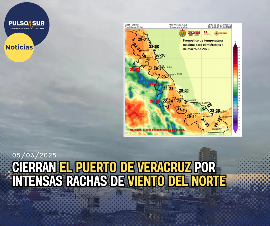La Capitanía de Puerto de Veracruz ha informado que, debido a las condiciones adversas generadas por el paso del Frente Frío 31, se ha decidido cerrar las bahías Norte y Sur a la navegación, tanto mayor como menor, este miércoles 5 de marzo. El evento de Norte podría generar rachas de hasta 85 km/h.