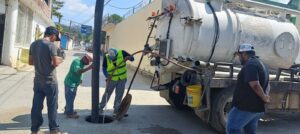 Personal de la Comisión de Agua Potable, Alcantarillado y Saneamiento del Estado de Guerrero realiza labores de desazolve en la red de atarjeas de la cabecera municipal de San Luis Acatlán, para mejorar la infraestructura sanitaria y garantizar un drenaje más eficiente.