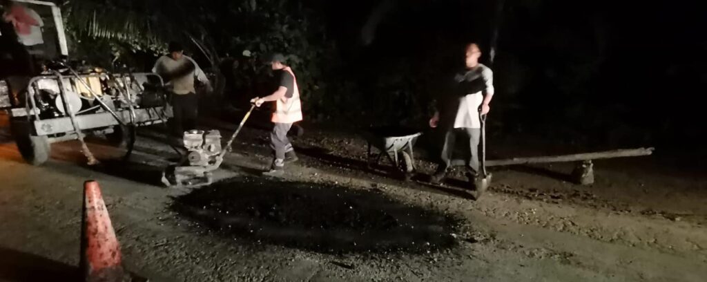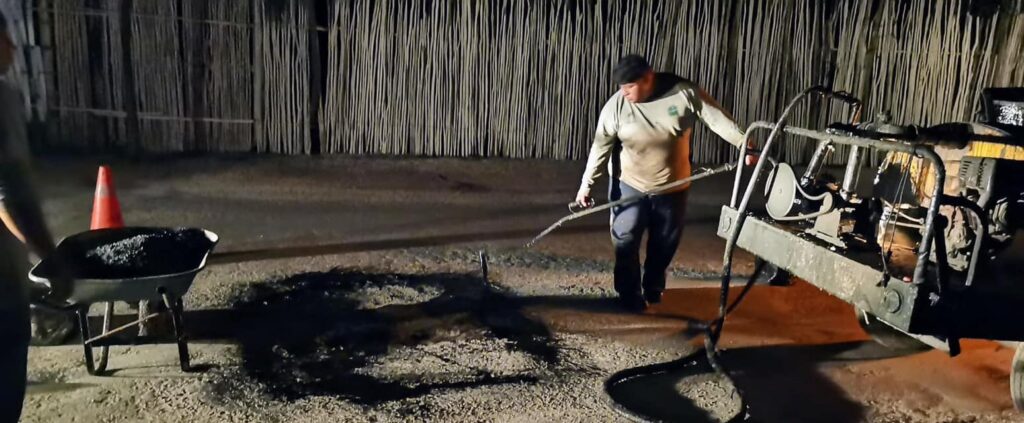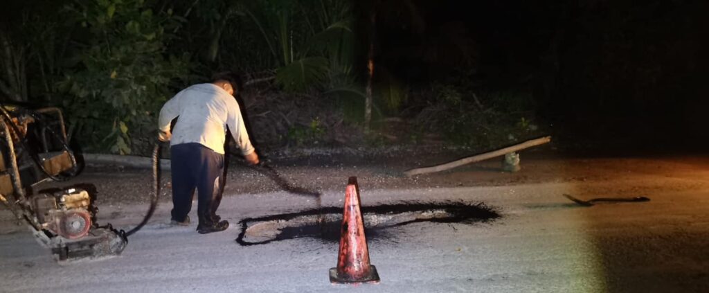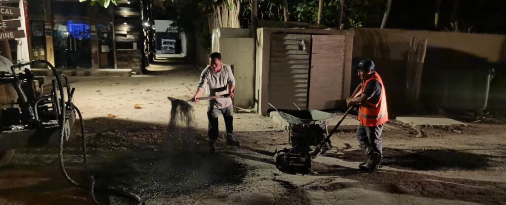 Por segunda noche consecutiva, el equipo de la Dirección de Servicios Públicos Municipales de Tulum lleva a cabo labores de reparación en las calles de la zona costera. Con un enfoque en minimizar las molestias y el congestionamiento vial, estos trabajos se realizan en horarios nocturnos para no interferir en la actividad diaria de la zona turística.