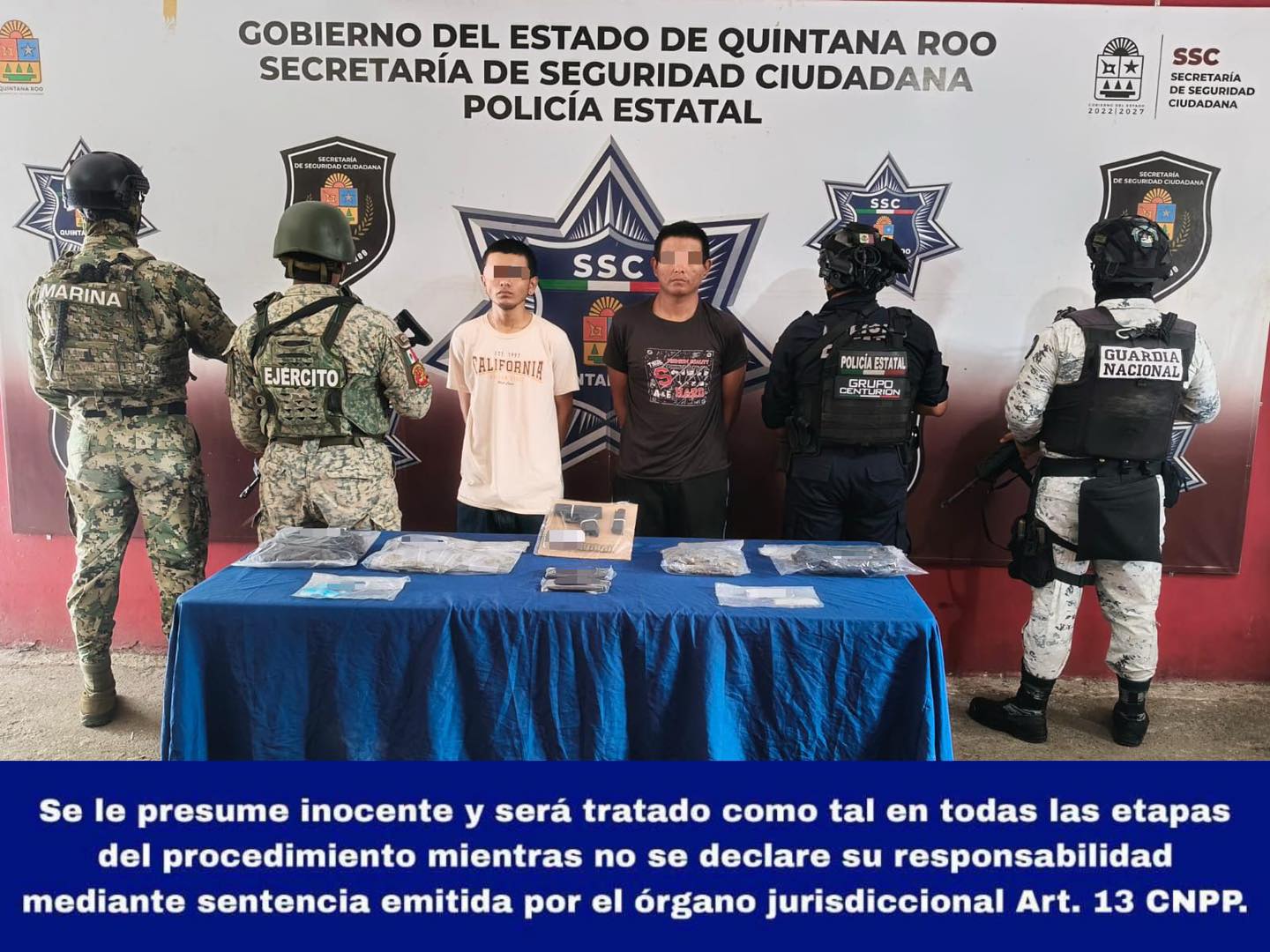 Benito Juárez, Quintana Roo, 11 de diciembre de 2025.— En una operación coordinada entre el Grupo Centurión de la Secretaría de Seguridad Ciudadana, la Secretaría de Marina, el Ejército Mexicano y la Guardia Nacional, fueron detenidos José Ignacio “N” y Diego “N”, señalados como presuntos implicados en delitos contra la salud y violaciones a la Ley Federal de Armas de Fuego y Explosivos.