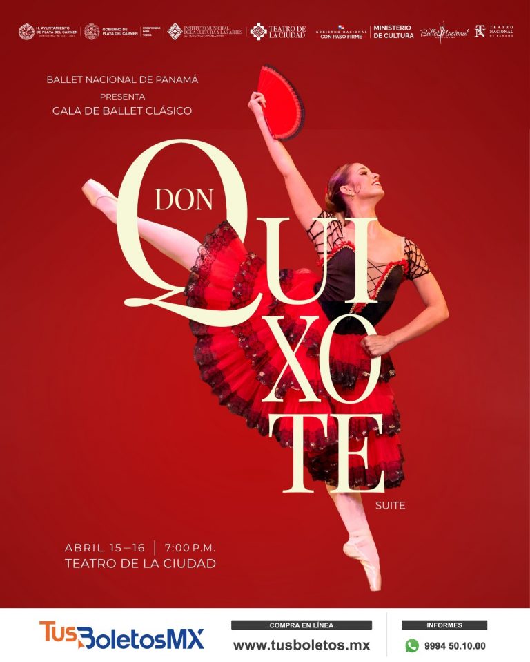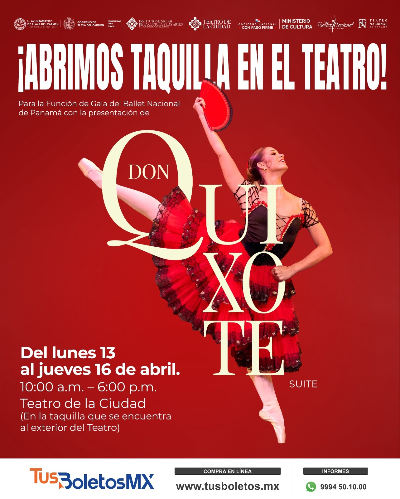 Playa del Carmen, Quintana Roo.- A un costo accesible, ya están a la venta en taquilla del Teatro de la Ciudad, de las 10 de la mañana a las 6 de la tarde, los boletos para las funciones del Ballet Nacional de Panamá, los días 15 y 16 de abril a las 7 de la noche con su espectáculo suite “Don Quixote”. También, a través de www.tusboletos.mx