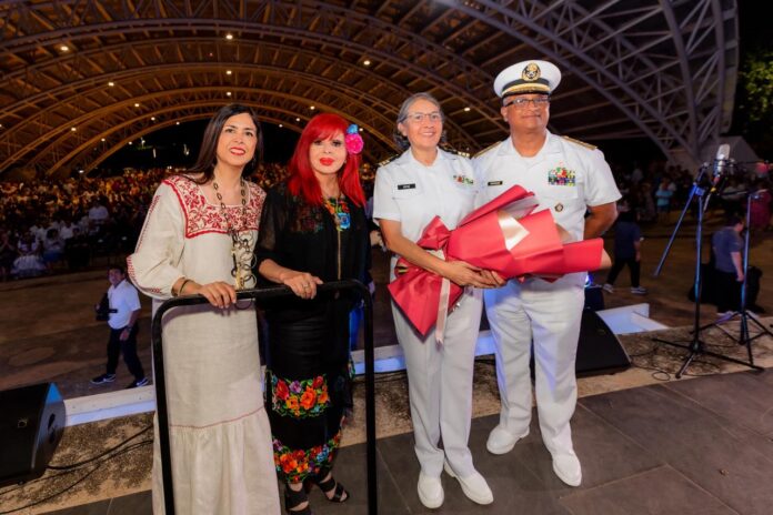 En una noche donde la magistral presentación de la Sinfónica y el Mariachi de la Secretaría de Marina cautivó a cientos de campechanos congregados en el Domo del Jaguar, la gobernadora Layda Sansores San Román entregó, simbolizada en un arreglo floral el reconocimiento del pueblo campechano a los integrantes de ambas agrupaciones musicales navales.