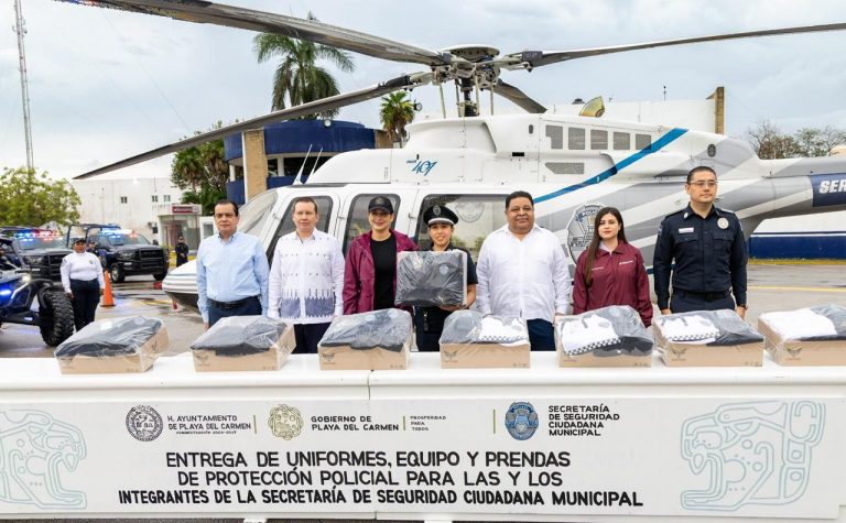 Playa del Carmen, Quintana Roo.— Con una inversión superior a 38.7 millones de pesos provenientes del Fondo de Aportaciones para el Fortalecimiento de los Municipios (FORTAMUN), la presidenta municipal Estefanía Mercado entregó uniformes, equipo táctico y cámaras corporales a elementos de la Secretaría de Seguridad Ciudadana Municipal (SSCM).