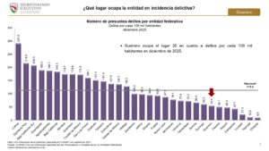 Chilpancingo, Gro. 20 de enero del 2026. – Guerrero se posicionó por debajo de la media nacional en incidencia delictiva durante 2025, al ubicarse en el lugar 26 del país en delitos por cada 100 mil habitantes en diciembre, y en el lugar 27 en el acumulado de enero a diciembre, de acuerdo con el Reporte del Centro Nacional de Información del Secretariado Ejecutivo del Sistema Nacional de Seguridad Pública, con corte al 31 de diciembre de 2025.