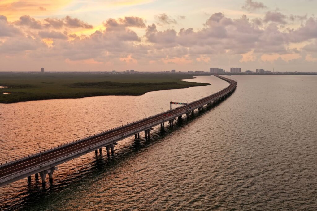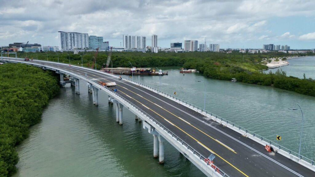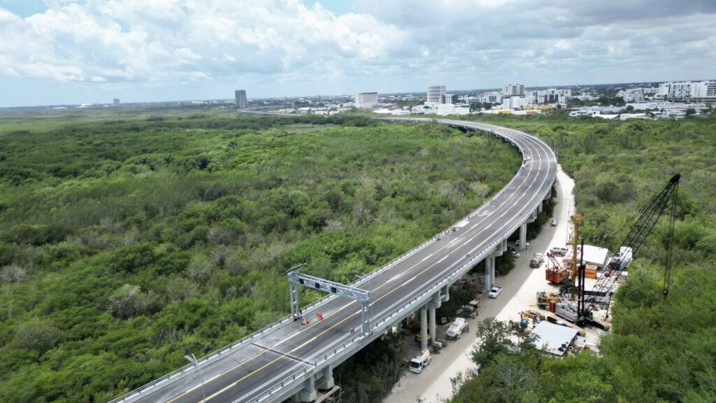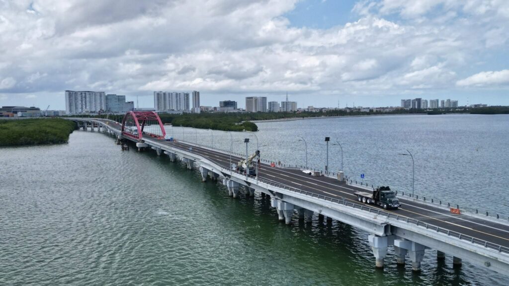 Con más de 8 kilómetros de longitud atravesando el sistema lagunar Nichupté, la obra destaca por su complejidad técnica. La cimentación en suelos blandos, la protección de manglares y un diseño estructural que equilibra funcionalidad, durabilidad y respeto ambiental, convierten al puente en un referente de la ingeniería moderna.
