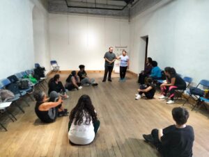 Durante la primera sesión, jóvenes y adultos participaron en ejercicios de relajación e integración mediante dinámicas lúdicas, así como prácticas de interpretación teatral y exploración de distintos niveles de la voz, orientadas al reconocimiento y uso consciente del cuerpo como herramienta expresiva.