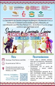 Chilpancingo, Gro., 09 de febrero de 2026.- La Secretaría de Gestión Integral de Riesgos y Protección Civil Guerrero (SGIRPCGRO) invitó a la ciudadanía a participar en el evento de senderismo y caminata canina “Caminando con amor dejando huella”, que se llevará a cabo el 15 de febrero de 2026, a las 7:00 horas, con punto de reunión en la Escuela Primaria Adolfo López Mateos, ubicada en la colonia PRD de Chilpancingo.