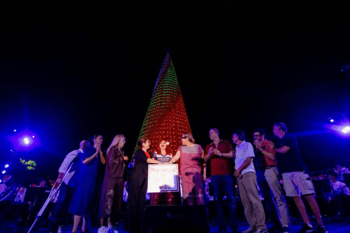 El monumental árbol navideño destelló con brillante iluminación de formas y colores al tiempo que la pirotecnia alumbraba el cielo campechano y se activaba la decoración del Palacio de Gobierno ante la admiración de los campechanos, especialmente los niños, que aplaudieron el mágico momento.