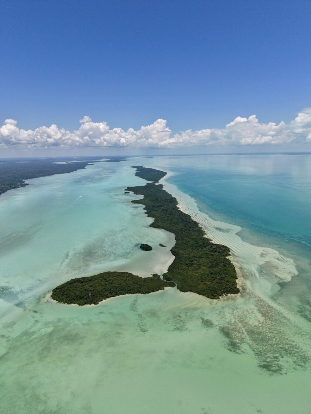 Vista aérea de la exuberante Isla de Tamalcab, rodeada de aguas cristalinas en la Bahía de Chetumal.