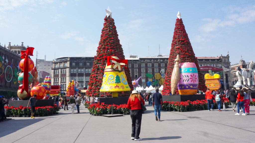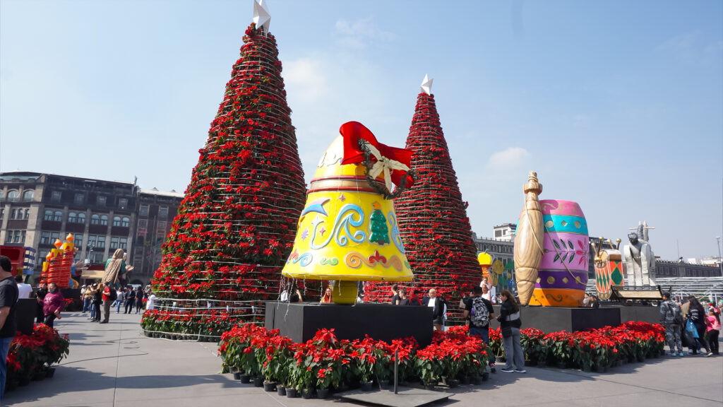Campanas, esferas gigantes y nochebuenas iluminadas adornan el emblemático espacio, ofreciendo a capitalinos y visitantes un recorrido visual que invita a caminar, tomarse fotografías y disfrutar de una postal navideña única con la Catedral Metropolitana como escenario principal.