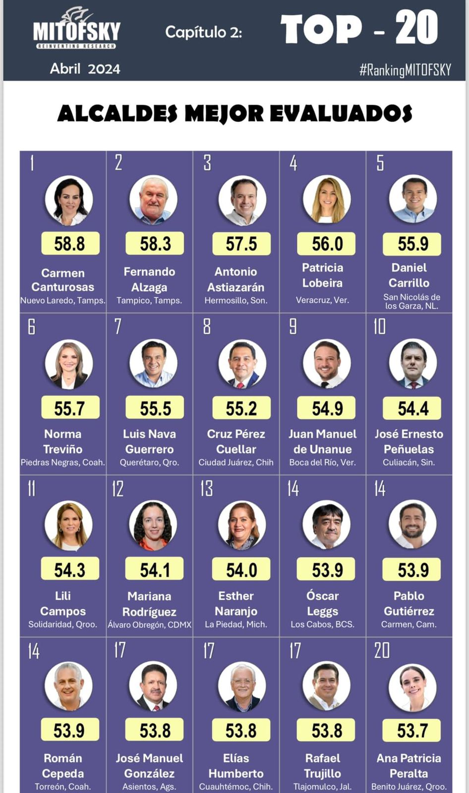 Lili campos se encuentra en el top 20 de las mejores alcaldes evaluadas en abril del 2024 ocupando la posición numero 11 con un 54.3 de aceptación