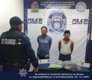En el segundo suceso, los agentes policiales aseguraron a Francisco “N”, de 45 años y originario también de Tabasco, y a Manuel “N”, de 55 años, proveniente de Chetumal. Ambos individuos fueron interceptados en la calle 19 Sur con avenida 135 de la colonia Bellavista mientras se encontraban intercambiándose varios envoltorios. Al revisar el contenido de dichos paquetes, se contabilizaron 63 envoltorios que se sospecha contenían marihuana.