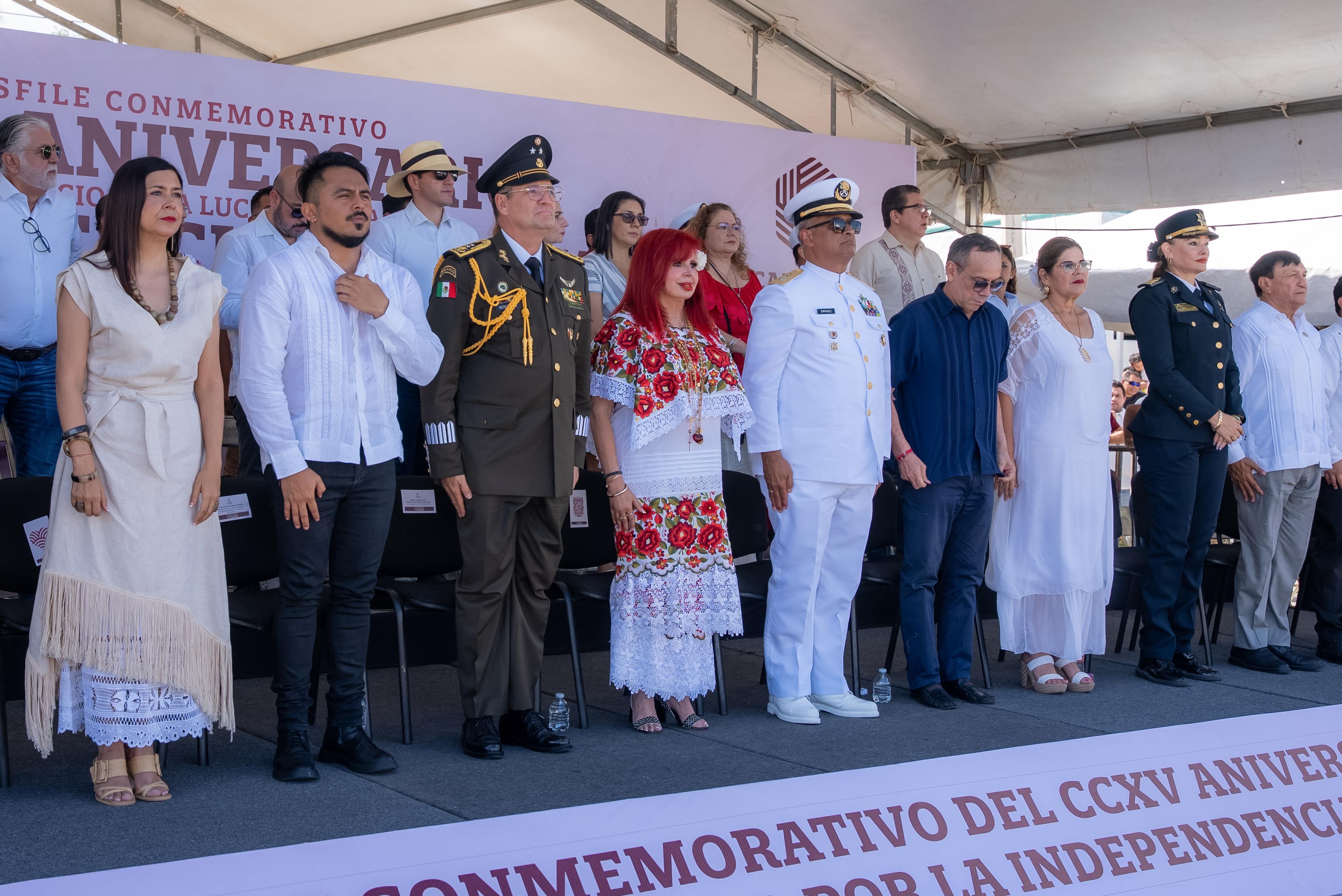 La gobernadora, Layda Sansores San Román, encabezó hoy la ceremonia de izamiento de nuestro Lábaro Patrio en la glorieta del asta bandera monumental, en el malecón de la ciudad capital, y presidió el desfile cívico-militar conmemorativo al CCXV Aniversario del Inicio de la Lucha de la Independencia Nacional.