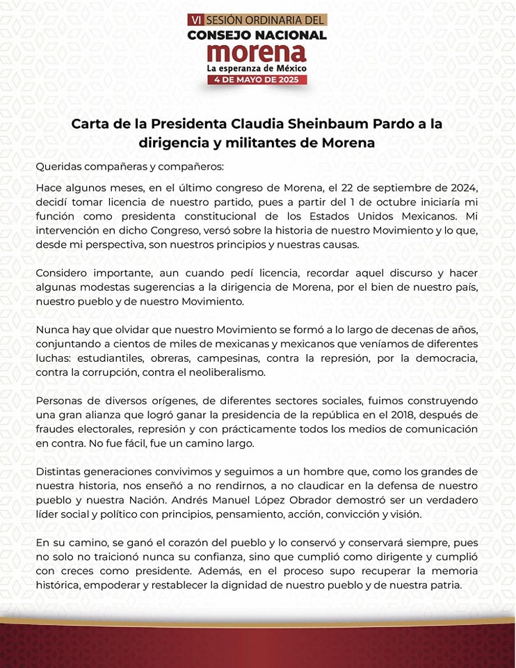 La Presidenta informó que su carta enviada a Morena contiene 10 puntos. El primero resalta la importancia de la unidad. Otros abordan la ética de la transformación, como evitar que los recursos económicos generen distinciones entre militantes y recordar que el poder debe ejercerse con humildad. También incluye reflexiones sobre la historia de México y el papel del PRI, subrayando que en Morena “no hay nada que se parezca al PRI” y que no existe vínculo alguno con la delincuencia. Asimismo, destacó que quienes ocupan cargos legislativos deben mantener un contacto directo con la ciudadanía, ya que para eso fueron electos, y recomendó evitar viajes innecesarios que los alejen de sus responsabilidades, sin importar el foro o evento al que asista