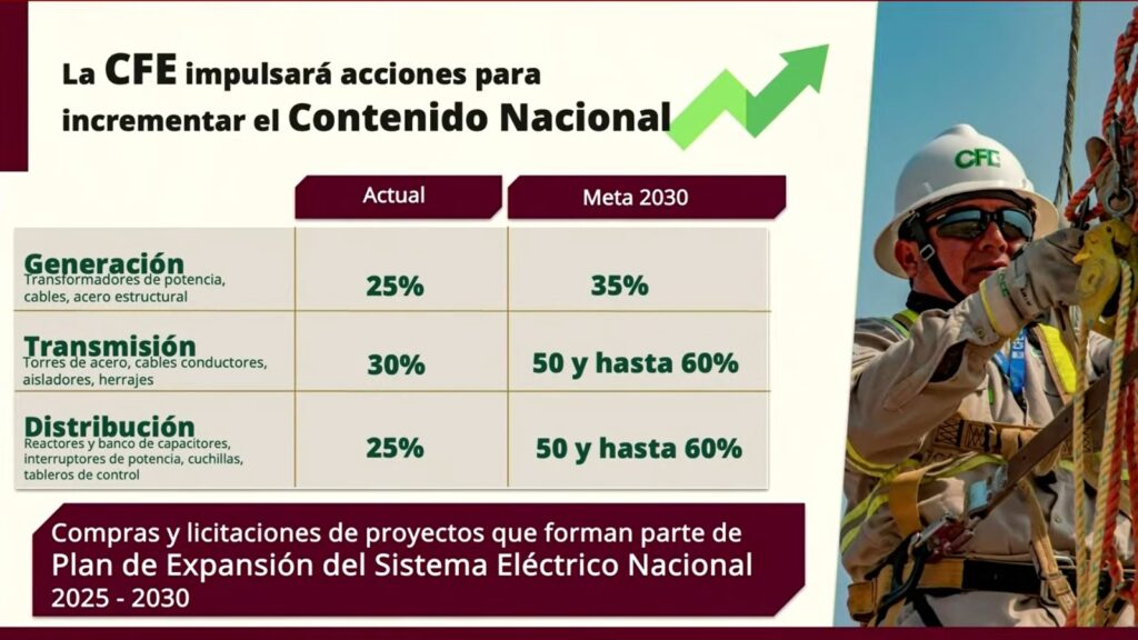 Luz Elena González, titular de la Secretaría de Energía, informó que la generación de energía incrementará su contenido nacional del 25 % al 35 %. En el caso de la transmisión, pasará del 30 % al 50 %, con la expectativa de alcanzar hasta un 60 % en ciertos segmentos.
