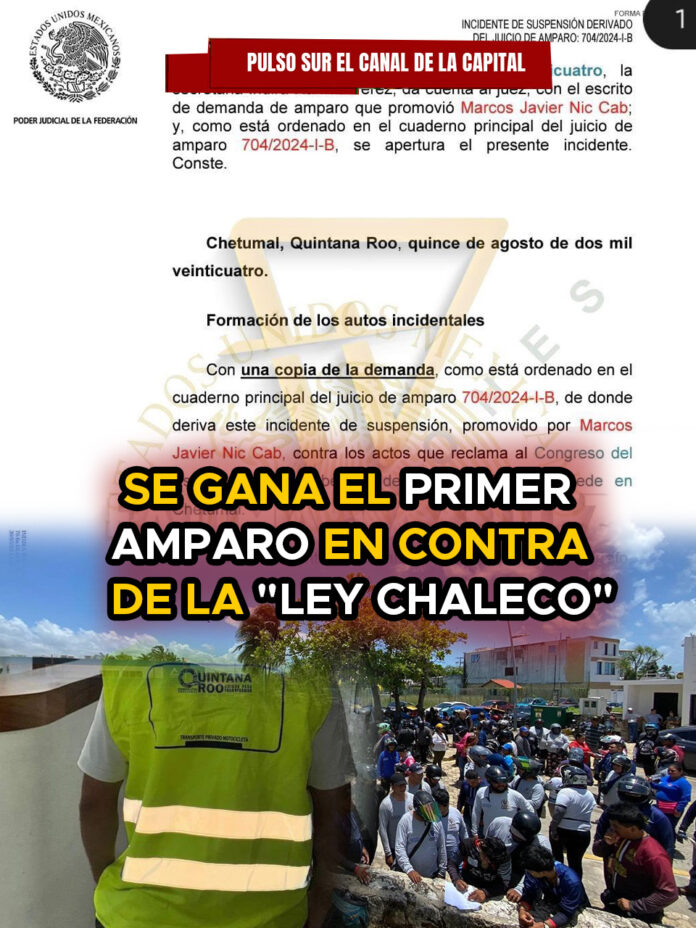 El licenciado Marcos Javier Nic Cab, abogado y motociclista, se convirtió en el primer individuo en obtener una suspensión provisional de la aplicación de la “Ley Chaleco”. Esta medida se derivó del juicio de amparo 704/2024-l-B, dictado el 15 de agosto de 2024.