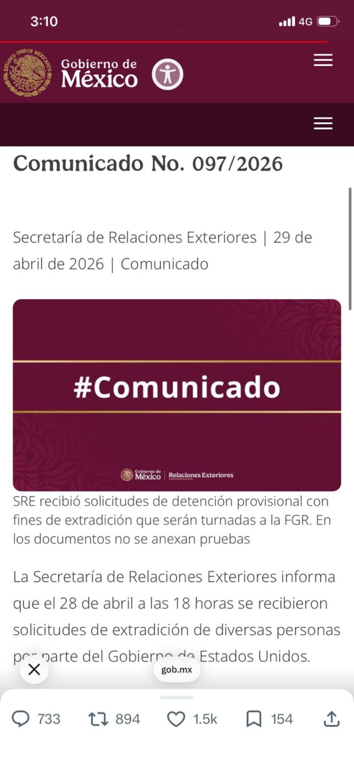 Además, la Secretaría de Relaciones Exteriores anunció que enviará un extrañamiento diplomático a la Embajada de Estados Unidos por la forma en que se hizo pública la información, al considerar que se vulneró la confidencialidad establecida en los mecanismos bilaterales de cooperación judicial.