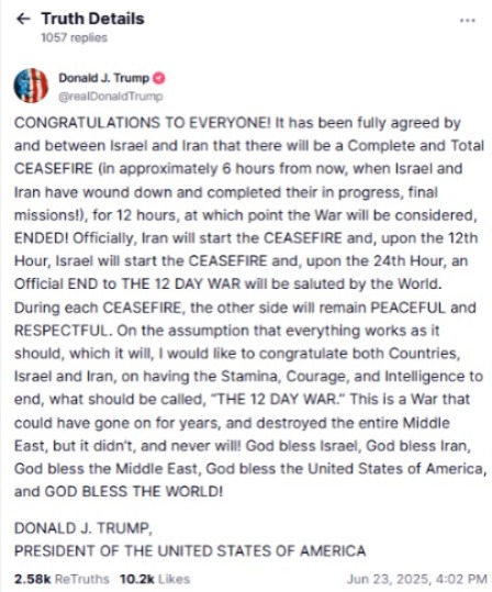 “Suponiendo que todo funcione como debería, que lo hará, me gustaría felicitar a ambos Países, Israel e Irán, por tener la Resistencia, el Valor y la Inteligencia para terminar, lo que debería llamarse, ‘LA GUERRA DE 12 DÍAS’. Esta es una Guerra que podría haber durado años, y destruido todo el Medio Oriente, pero no lo hizo, ¡y nunca lo hará! Dios bendiga a Israel, Dios bendiga a Irán, Dios bendiga al Medio Oriente, Dios bendiga a los Estados Unidos de América, y ¡Dios bendiga al mundo!”.