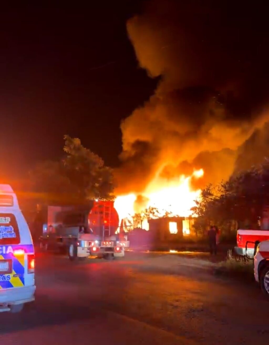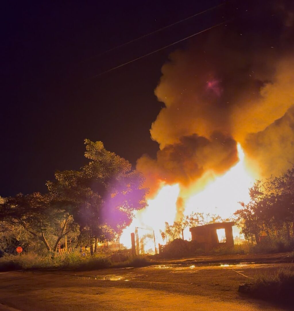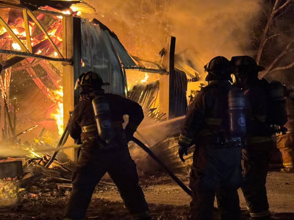 13/Enero/2026.— Un fuerte incendio registrado la tarde-noche de este jueves redujo a cenizas una bodega de mobiliario hotelero ubicada en la región 247 de Cancún, dejando importantes pérdidas materiales y generando alarma entre vecinos de la zona.